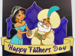 | This pin features Princess Jasmine and her father, The Sultan of Agrabah. A Banner across the pin reads "Happy Father's Day." Size: 3" W x 2.21" H The pin was released at Mickey's of Glendale online in April 2021. |