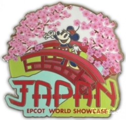 | Part of an Open Edition set spotlighting the International Countries in World Showcase at EPCOT in Disney World. This pin features Minnie Mouse in her original classic red-and-white outfit standing on a red bridge surrounded by boughs of pink cherry blossom flowers. Lettering at the bottom reads "Japan EPCOT World Showcase". |