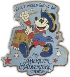 | Part of an Open Edition set spotlighting the International Countries in World Showcase at EPCOT in Disney World. This pin features a light blue background with red and white stars. Mickey Mouse (facing left) marches in Colonial costume while beating a drum. His tricorn had is dark blue with gold trim to match his shoes with gold buckles. His long-tailed coat is a lighter shade of blue, showing red shorts and trim. |
