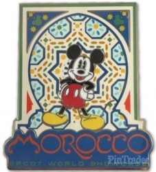 | Part of an Open Edition set spotlighting the International Countries in World Showcase at EPCOT in Disney World. This pin features Mickey Mouse in classic style and outfit standing with hands on hips. The background is part of the renowned mosaic tile feature at the Morocco showcase. Orange and green lettering at the bottom reads "Morocco EPCOT World Showcase". |
