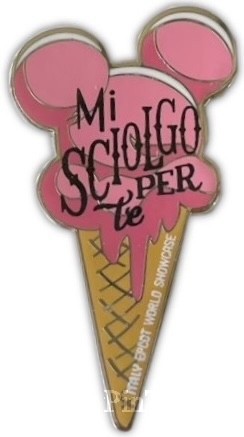 | Part of an Open Edition set spotlighting the International Countries in World Showcase at EPCOT in Disney World. This pin features a classic waffle cone with a scoop of pink ice cream or Spumoni in the shape of Mickey Mouse's head. Black lettering on the ice cream says "Mi Sciolgo te Per" which translates to “I melt for you.” While lettering along the edge of the cone reads "Italy EPCOT World Showcase". |