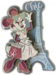 | Part of an Open Edition set spotlighting the International Countries in World Showcase at EPCOT in Disney World. This pin features Minnie Mouse in couture fashion in front of the Eiffel Tower. She faces right and wears dark rose-colored high heels and hair bow with a matching purse or shopping bag hanging on her right arm. Her dress is white with pale pink flowery designs on it. Her left hand raises her heart-shaped sunglasses from her eyes. The Eiffel Tower is shown in white illustration style with a fancy lettering of the word "Chic" at the top. |
