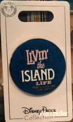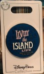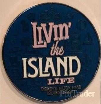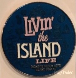 | Blue, circular pin that reads "Livin' The Island Life, Disney's Hilton Head Island Resort. |