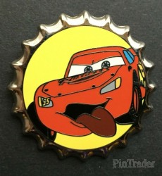 | Lighting McQueen (Pixar - Cars) appears in his classic red and yellow paint job. His toungue is hanging/sticking out of his hood/mouth. The pin background is yellow. The pin base is cut like a soda bottle cap. Metal base is silver. Back: - 1 post - 2 nubs - 3 boxes: DPT logo, copyright, LE 500 One of fifteen (15) pins in a mystery box set sold at WDW. Each pin features Disney character(s) from the waist up. Edition size varies from pin to pin in the set (250 to 1000). Two pins per box. |