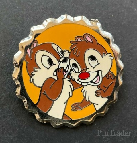 | Chip and Dale are shown from the waist up. they appears in brown fur. Chip is whispering into Dales ear. The pin background is orange. The pin base is cut like a soda bottle cap. Metal base is silver. Back: - 1 post - 2 nubs - 3 boxes: DPT logo, copyright, LE 1000 One of fifteen (15) pins in a mystery box set sold at WDW. Each pin features Disney character(s) from the waist up. Edition size varies from pin to pin in the set (250 to 1000). Two pins per box. |