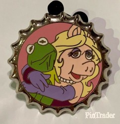 | Kermit and Miss Piggy (Muppets) are featured. Kermit appears in classic green. Miss Piggy's sports blonde hair, pearl necklace and purple gloves. The pin background is mauve/pink. The pin base is cut like a soda bottle cap. Metal base is silver. Back: - 1 post - 2 nubs - 3 boxes: DPT logo, copyright, LE 250 One of fifteen (15) pins in a mystery box set sold at WDW. Each pin features Disney character(s) from the waist up. Edition size varies from pin to pin in the set (250 to 1000). Two pins per box. |