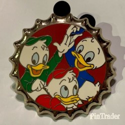 | Huey, Dewey, and Louie Duck are featured. Huey is dressed in red, Dewey in blue, and Louie in green (shirt and baseball cap.) The pin background is red. The pin base is cut like a soda bottle cap. Metal base is silver. Back: - 1 post - 2 nubs - 3 boxes: DPT logo, copyright, LE 250 One of fifteen (15) pins in a mystery box set sold at WDW. Each pin features Disney character(s) from the waist up. Edition size varies from pin to pin in the set (250 to 1000). Two pins per box. |