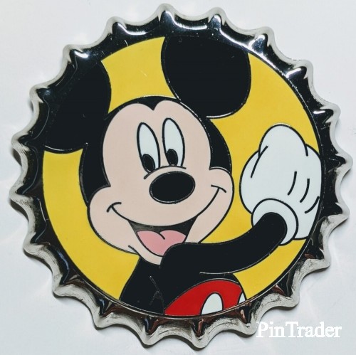 | Mickey Mouse is shown from the waist up. He is wearing his classic red shorts and white gloves. He smiles at the viewer and his arm is reaching over his shoulder as if to say 'let's go'. The pin background is yellow. The pin base is cut like a soda bottle cap. Metal base is silver. Back: - 1 post - 2 nubs - 3 boxes: DPT logo, copyright, LE 500 One of fifteen (15) pins in a mystery box set sold at WDW. Each pin features Disney character(s) from the waist up. Edition size varies from pin to pin in the set (250 to 1000). Two pins per box. |