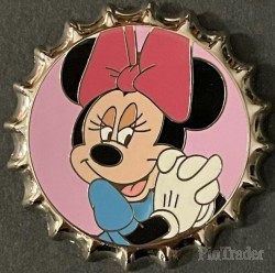 | Minnie is wearing a blue shirt and a dark pink bow. She has her hands together and her fingers are intertwined. The background of this bottlecap shaped pin is pink. One of fifteen (15) pins in a mystery box set sold at WDW. Each pin features Disney character(s) from the waist up. Edition size varies from pin to pin in the set (250 to 1000). Two pins per box. |