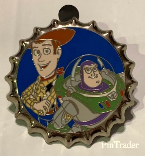 | Woody and Buzz are featured. Woody sports his brown hat, plaid shirt, and blue pants. Buzz is in his purple, green and white space suit. The pin background is blue. The pin base is cut like a soda bottle cap. Metal base is silver. Back: - 1 post - 2 nubs - 3 boxes: DPT logo, copyright, LE 250 One of fifteen (15) pins in a mystery box set sold at WDW. Each pin features Disney character(s) from the waist up. Edition size varies from pin to pin in the set (250 to 1000). Two pins per box. |