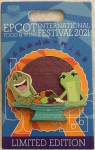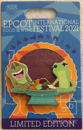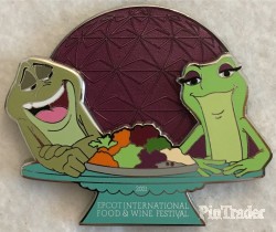 | Prince Naveen and Tiana from Disney's "The Princess and the Frog" are featured on this pin. Both characters are frogs. A plate of food sits between them. Spaceship Earth is between them, in the back. |