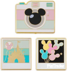 Take advantage of a special photo opp with this set from our Pin & Flair Collection. Mickey Mouse icon balloons appear in the two picture pins and the camera pin features a Mickey icon lens.