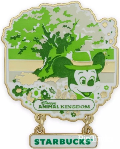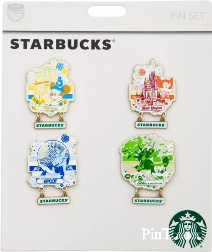 Starbucks joins The World's Most Magical Celebration with a four pin collection featuring Mickey Mouse, Figment, and iconic attractions for each of the four parks at Walt Disney World Resort, all with a dangling Starbucks logo.