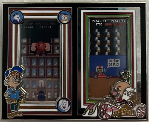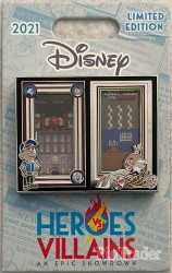 | • Featuring Fix-It Felix and King Candy in a Multi-Plane, shadow box cast • Back of pin- 2 pin post, Pin trading Logo, Limited Edition of 1000, FAC#, ©Disney and Made in China. • 3 Layer Pin on pin on pin, Clear Acetate, Stained Glass • Artist Jes Willis • Dimensions: 1.58” x 2.00” • Item #19 The Heroes vs Villains pin event was held virtually on December 4, 2021. Pins from the event were shipped prior to the event. |