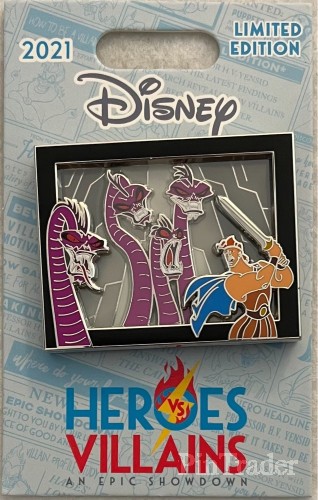 | • Multi-Plane, shadow box pin featuring Hercules and the Hydra. • Artist: Jes Willis • Dimensions: 1.58” x 2.00” • Item #16 The Heroes vs Villains pin event was held virtually on December 4, 2021. Pins from the event were shipped prior to the event. |