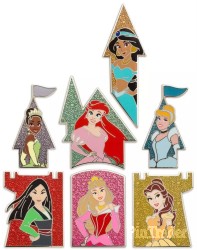 | Piece together a castle full of Fantasyland icons with this novel set of seven Disney Princess pins. Each pin features a princess within a section of the building that, when arranged together, creates a completed castle. Magic in the details * Set of seven Disney Princess pins on card * Includes Cinderella, Aurora, Ariel, Belle, Jasmine, Tiana, and Mulan * Each pin forms a piece of the Fantasyland Castle * Enameled cloisonné * Each piece features a different colored translucent filigree background * Nickel finish * Comes assembled on card * Mickey icon pin backs The bare necessities * Metal / enamel * Mulan + Tiana pins: approx. 2 5/6'' H x 1 1/10'' W * Aurora + Ariel pins: approx. 3'' H x 1 2/5'' W * Jasmine pin: approx. 2 1/3'' H x 4/5'' W * Belle + Cinderella pins: approx. 2 5/6'' H x 1 1/10'' W * Imported |