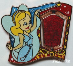 | Blue Fairy is shown in her blue dress and wings. There is a blue rope belt at her waist with a heart. Her hand/arms reach out towards the spinner element. The spinner shows Pinocchio as a puppet and real boy. Back: - 2 posts - 4 boxes (DPT, LR, Copyright, FAC) - Mickey head icon waffle pattern - Rose gold finish Two pins per box. |