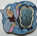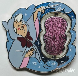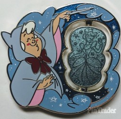 | Fairy God Mother is shown in her blue hooded robe with red bow. Her hand/arms reach out towards the spinner element. The spinner shows Cinderella before and after her dress transformation. Back: - 2 posts - 4 boxes (DPT, LR, Copyright, FAC) - Mickey head icon waffle pattern - Silver finish Two pins per box. |