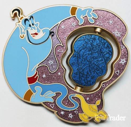 | Genie is shown in his blue pants and red cummerbund (pleated, broad waist sash). He is flowing out of the gold lamp. His hand/arms reach out towards the spinner element. The spinner shows Genie as entertainer and tourist. Back: - 2 posts - 4 boxes (DPT, LR, Copyright, FAC) - Mickey head icon waffle pattern - Silver finish Two pins per box. |