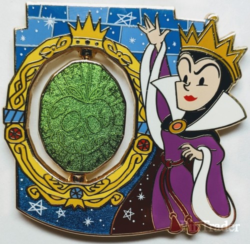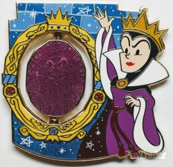 | The Evil Queen is shown in front of her magic mirror. She wears her gold crown, black head cover, white/purple high collar robes. Her hand/arms reach out towards the spinner element. The spinner shows Old Hag and poison apple. Back: - 2 posts - 4 boxes (DPT, LR, Copyright, FAC) - Mickey head icon waffle pattern - Gold finish Two pins per box. |