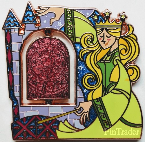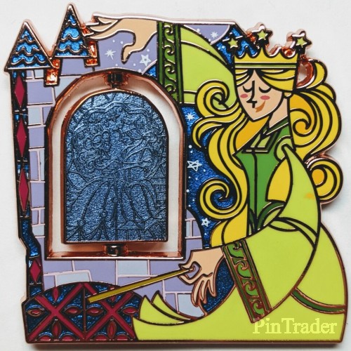 | Enchantress is shown in her bright green robes and flowing yellow hair with gold crown. She holds a brown wand. Her hand/arms reach out towards the spinner element. The spinner shows Belle/Prince Adam and the red rose under the glass dome. Back: - 2 posts - 4 boxes (DPT, LR, Copyright, FAC) - Mickey head icon waffle pattern - Rose gold finish Two pins per box. |
