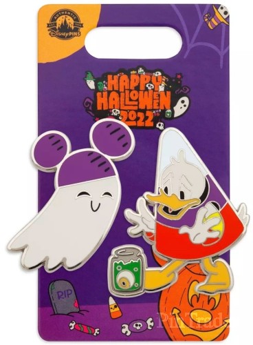 This two-piece ''Happy Halloween'' pin set is perfect for tricks-and-treats or just the fun of collecting. Donald Duck in a candy corn costume teams-up with a mouse-eared ghost for this commemorative 2022 pair.