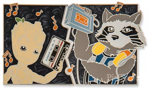 Disney duos pose for pair of pins from our Pin Pals series, part of the Disney One Family Pin Celebration 2022. These two pins featuring Rocket and Groot fit together to make a larger scene.
