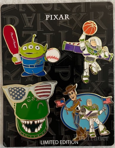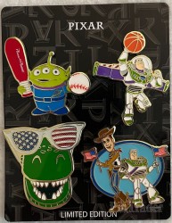 | • Limited edition of 1,000 pieces • Made from a minimum of 25% recycled material • This 4-piece pin set features Toy Story characters with • American sport inspired art. • Baseball themed Alien, basketball themed Buzz Lightyear, Rex sporting American Flag sunglasses, and Buzz Lightyear and Woody waving American flags. • Made of hard enamel that is guaranteed not to discolor with a high-quality gold tone metal finish |