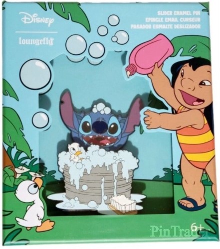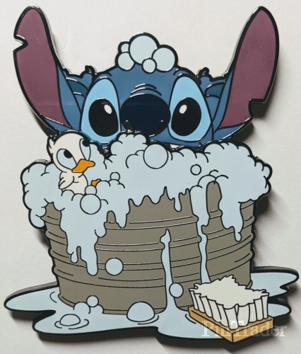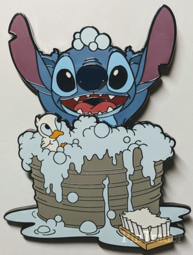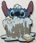 | Stitch is taking a bath. He is in a grey metal tub surrounded by bubbles. A duckling is sitting in the blue bubbles. A white and brown scrub brush is on the floor. Water is spilling out of the tub. Stitch has his arms raised/in the air and is smiling/having fun. The pin rotates about 30 degrees as well as Stitch sliding into and out of the water/bubbles. |