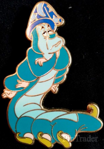 | This pin from the Sorcerer Hat Character series features the Caterpillar from Alice in Wonderland. He is sitting on his back end and facing right, with his six feet splayed out, his top two arms crossed, and his other four hands on his hips. He is rolling his eyes to the left and looking unamused. |