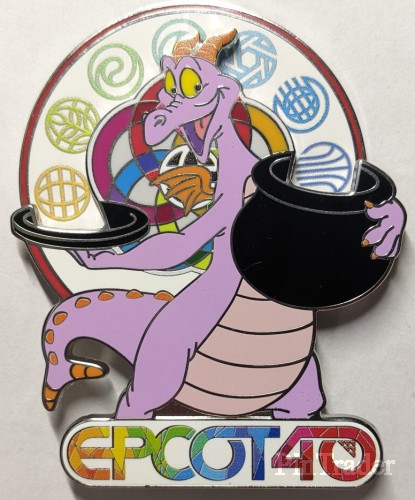 | Pin features Figment balancing a black disk/plate and holding a black pot of logo gold. Behind Figment is the multi-colored five ringed Epcot park logo representing information, technology, environment, education and entertainment. The bottom of the pin has the Epcot40 log in yellow, orange, green, blue, pink and red. The spinner element has the twelve (12) park logos represent: Space Galaxy Play Motion Imagination World Celebration Spaceship Earth Odyssey Seas Journey of Water Land World Showcase Back: - 3 posts - 6 nubs - 6 boxes ( LE, FAC, DPT logo, Epcot 40, China, Copyright) - Mickey icon waffle pattern - silver finish |