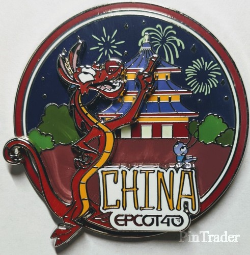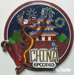 | One of eleven (11) pins featuring the countries in Epcot's World Showcase. Each pin shows a structure or building from the country, blue night sky and fireworks. The character, country name and "Epcot40" are pin on pin. This pin features Mushu from Mulan. The round pin has an orange-red frame. |