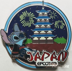 | One of eleven (11) pins featuring the countries in Epcot's World Showcase. Each pin shows a structure or building from the country, blue night sky and fireworks. The character, country name and "Epcot40" are pin on pin. This pin features a sitting Stitch in black robe and red belt. The round pin has a blue frame. |