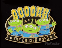 | Three Little Green Men Aliens from the "Toy Story" series of movies by PIXAR are depicted on this pin. At the top of the pin is the word OOOOHH and at the bottom of the pin are the words "The Chosen Ones." This pin was available in the LE200 set. It was also available for purchase for $30 HKD, with the minimum purchase of $300 HKD of merchandise. Only 100 of these pins were sold individually. This pin was released at a Hong Kong pop-up shop in January 2021. The release was originally scheduled for late 2020, but was delayed due to the COVID-19 pandemic. The release of this, and two other pins, was originally scheduled for February 12, 2021 to March 14, 2021. |