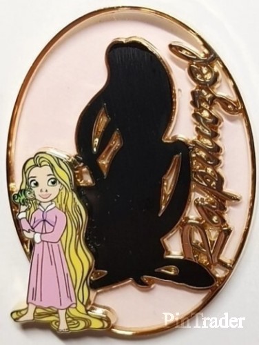 | Oval pin featuring Rapunzel (Tangled). She appears as a youth (pin on pin) and adult (silhouette). A young Rapunzel she is wearing a pink dress. A green Pascal is on her shoulder Her long blond hair is pooling around her feet. As grown up Rapunzel she wears a dress. Background is pink stained glass. Along the right side 'Rapunzel' is written in gold. Approximate Size: 2.25X1.75 Back: - 2 posts - 2 boxes (DSSH logo, LE, copyright, FAC) - ice cream waffle pattern (does not reach to edges, typical for stained glass element) - gold finish The D23 2022 event was held September 9-11, 2022. |