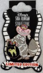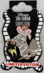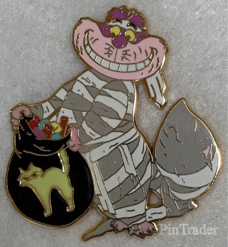 | This Halloween release at the Disney Soda Fountain features the Cheshire Cat from Alice in Wonderland dressed as a Mummy with a black bag for candy that has a green cat on it. The green cat glows in the dark. |