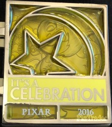 | This is the 12th of a 13 pin collection released once per month leading into the 2016 Pixar Party Pin Trading Event. This pin features a stained glass front of the Pixar Ball logo that hinges open to show a sculpted Joy and Sadness. |