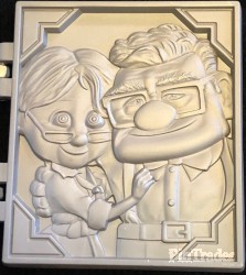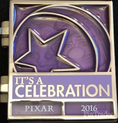 | This is the 10th of a 13 pin collection released once per month leading into the 2016 Pixar Party Pin Trading Event. This pin features a stained glass front of the Pixar Ball logo that hinges open to show a sculpted Ellie and Carl. |