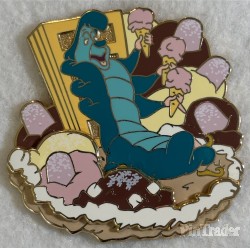 | Absolem sits on what might be a frosting-edged cookie, or a very large scoop of ice cream with whipped cream. Multiple scoops of vanilla, chocolate and strawberry ice cream surround him, topped with pink gumdrops, and he leans back against a rectangular wafer cookie. Three of his arms hold strawberry ice cream cones and his other three arms are stretched behind him in relaxation. His bottom two legs are crossed; his other four legs aren't visible. |