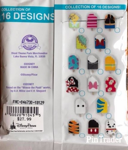 | Pins are in the shape of ice cream bars. There are sixteen (16) pins in the set and the characters featured are: - Tinker Bell (Peter Pan) - Cheshire Cat (Alice in Wonderland) - Goofy - Heimlich (A Bug's Life) - Donald Duck - Jack Skellington (Nightmare Before Christmas) - James P. "Sulley" Sullivan (Monsters Inc. and Monsters University) - Pluto - Minnie Mouse - Mickey Mouse - Marie (The Aristocats) - Lilo (Lilo & Stitch) - Baymax (Big Hero 6) - Flounder (The Little Mermaid) - Tigger (Winnie the Pooh) - Lucky (101 Dalmatians) FAC-046730-18129 |