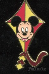 | This pin features a yellow & red kite with the face of Mickey Mouse in the center |