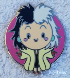 | Cruella out of a serie featuring 16 designs of various Disney Villains as drawn by the artist Jerrod Maruyama . Each is inside a purple circle and is a chibi-style animation. A pin pack contains 5 randomly selected pins. |