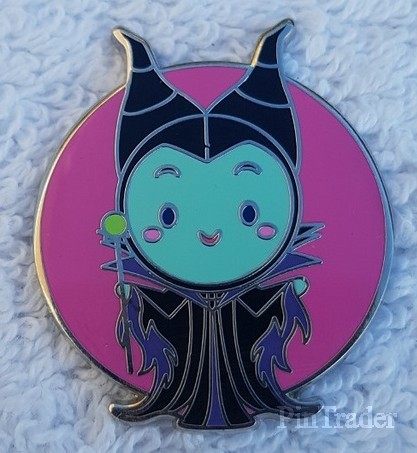 | Maleficent out of a serie featuring 16 designs of various Disney Villains as drawn by the artist Jerrod Maruyama . Each is inside a purple circle and is a chibi-style animation. A pin pack contains 5 randomly selected pins. Sleeping beauty |