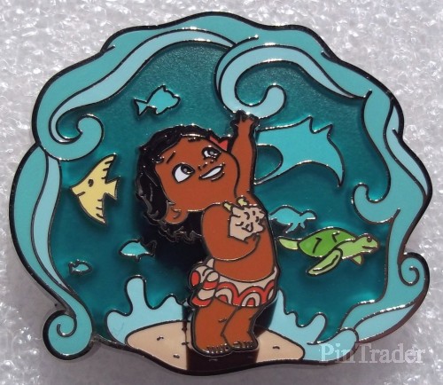 | This third pin in the bi-monthly Under the Sea series showcases Moana as a toddler, she is holding a sea shell and reaching up to touch the ocean waves. Moana is a pin on pin element. The water from the sea is translucent blue and showcases a few marine animals including a manta ray, turtles and several fish. |
