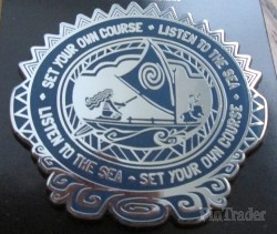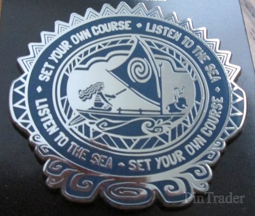 | Moana, Pua, and Hei Hei ride her canoe inside a circle with the words "Set Your Own Course" and "Listen to the Sea." |