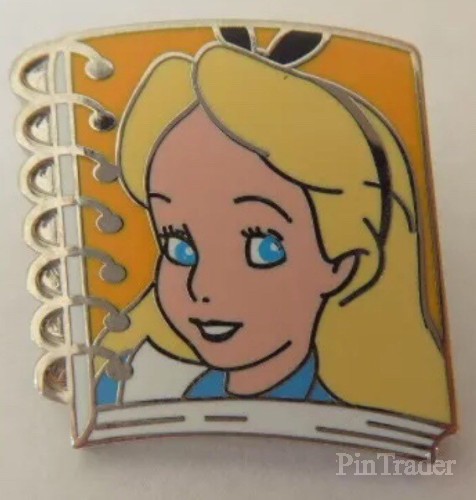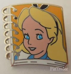 | One of six pins that features characters on spiral notebooks. This one features Alice on an orange notebook |