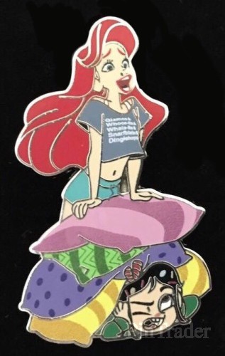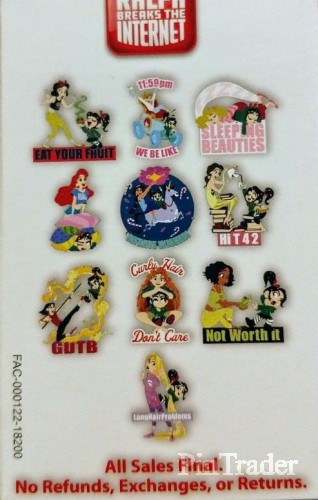 | Set contains 10 pins as follows: • Vanellope and Mulan - GDTB • Vanellope and Snow White - Eat Your Fruit • Vanellope and Aurora - Sleeping Beauties • Vanellope and Ariel on a stack of pillows • Vanellope and Merida - Curly Hair Don't Care • Vanellope and Belle - Hi T 4 2 • Vanellope and Jasmine - Infinite Wishes • Vanellope and Rapunzel - Long Hair Problems • Vanellope and Cinderella - 11:59 pm We Be Like • Vanellope and Tiana - Not Worth It Features ten Disney princesses from the following movies: • Mulan • Beauty and the Beast • Brave • Tangled • Cinderella • Snow White • Princess and the Frog • Sleeping Beauty • The Little Mermaid • Aladdin |