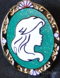 | This pin shows Ariel on a green background. This mystery set of 8 pins come in mystery boxes of two pins. Each pin has the white cameo style silhouette of a princess on a glittery color background with a frame unique to each princess. Princesses in series are Snow White, Ariel, Cinderella, Aurora, Jasmine, Belle, Rapunzel and Tiana. |