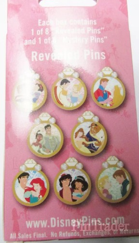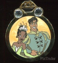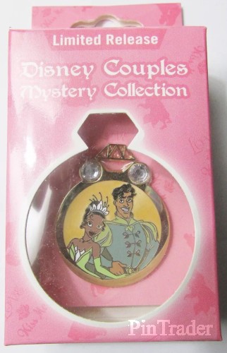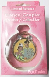 | This is a revealed pin in the Disney Couples Mystery Collection - Reveal & Conceal. This pin features Tiana and Prince Naveen from Disney's "Princess and the Frog." The revealed pin was shown in a ring cut-out in the front of the box. The concealed pin was inside a black bag, behind the revealed pin. The price listed is the price for the 2 pins (in one box). |