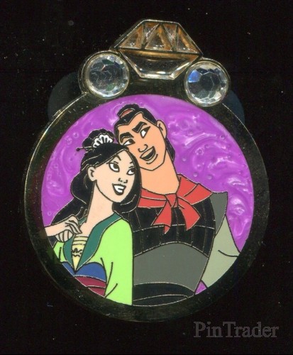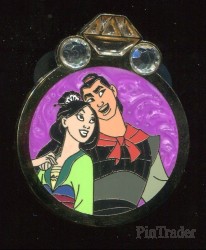| This is a concealed pin in the Disney Couples Mystery Collection - Reveal & Conceal. This pin features Mulan and Li Shang from Walt Disney's "Mulan." The revealed pin was shown in a ring cut-out in the front of the box. The concealed pin was inside a black bag, behind the revealed pin. The price listed is the price for the 2 pins (in one box). |
